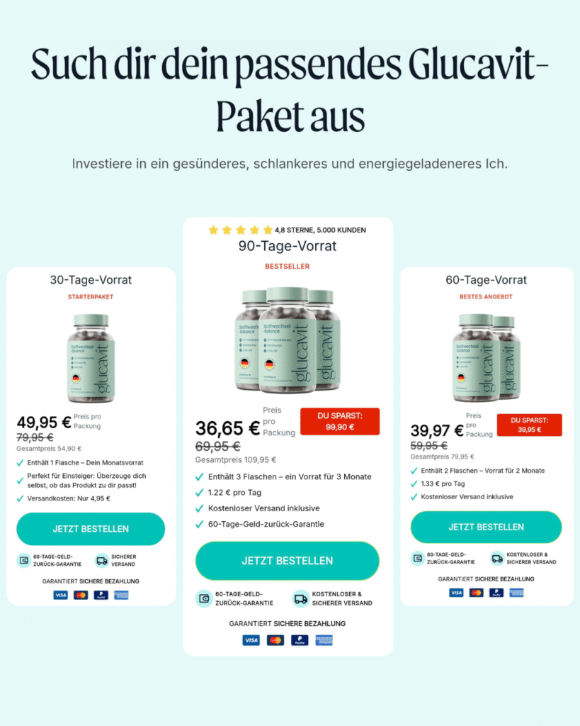 Verpassen Sie nicht die 100 % natürlichen Vorteile von Glucavit! Hören Sie auf zu warten – starten Sie jetzt mit Ihrer Gewichtsabnahme, steigern Sie Ihre Energie und übernehmen Sie wieder die Kontrolle über Ihren Körper.